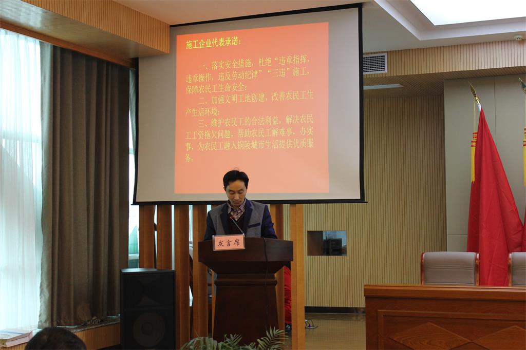 關(guān)愛(ài)農(nóng)民工源于內(nèi)心、貴在堅(jiān)持。活動(dòng)現(xiàn)場(chǎng),安徽國(guó)泰建筑有限公司杜軍云代表作出了關(guān)愛(ài)農(nóng)民工的莊嚴(yán)承諾,農(nóng)民工代表承諾將立足本職工作,苦練技能,為建設(shè)銅陵文明之城增光添彩。
