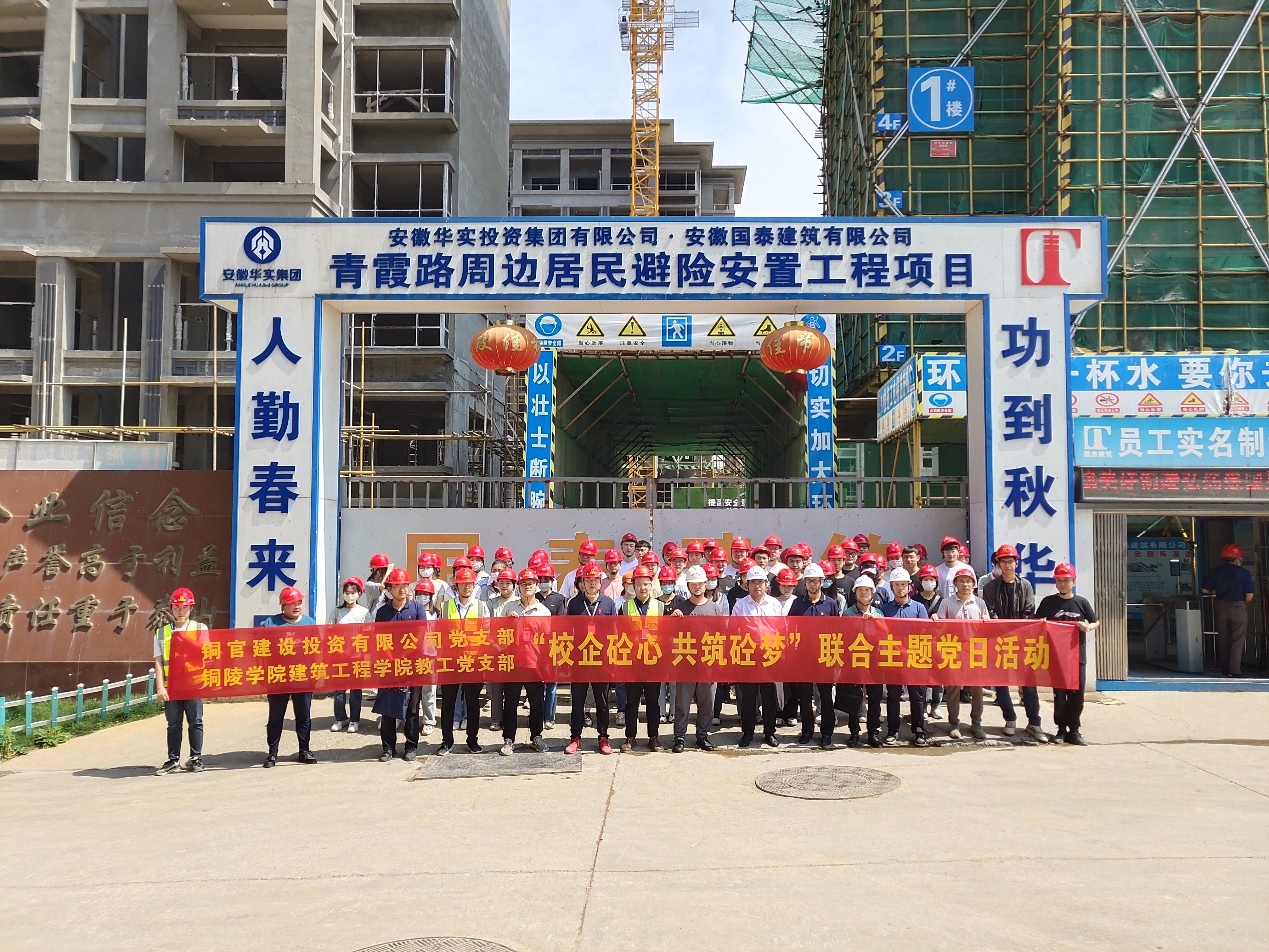 為深入學習貫徹黨的二十大精神,進一步落實新時代黨建工作的新要求,拓展校企合作新思路、新模式。2023年5月19日上午,安徽華實投資集團有限公司黨支部、銅官建設(shè)投資有限公司黨支部聯(lián)合銅陵學院建筑工程學院教工黨支部,到我公司青霞路周邊居民避險安置工程項目開展“校砼企心 共筑砼夢”主題黨日活動。雙方就加深校企合作、黨建共建、項目實地考察等主題開展了研討交流。