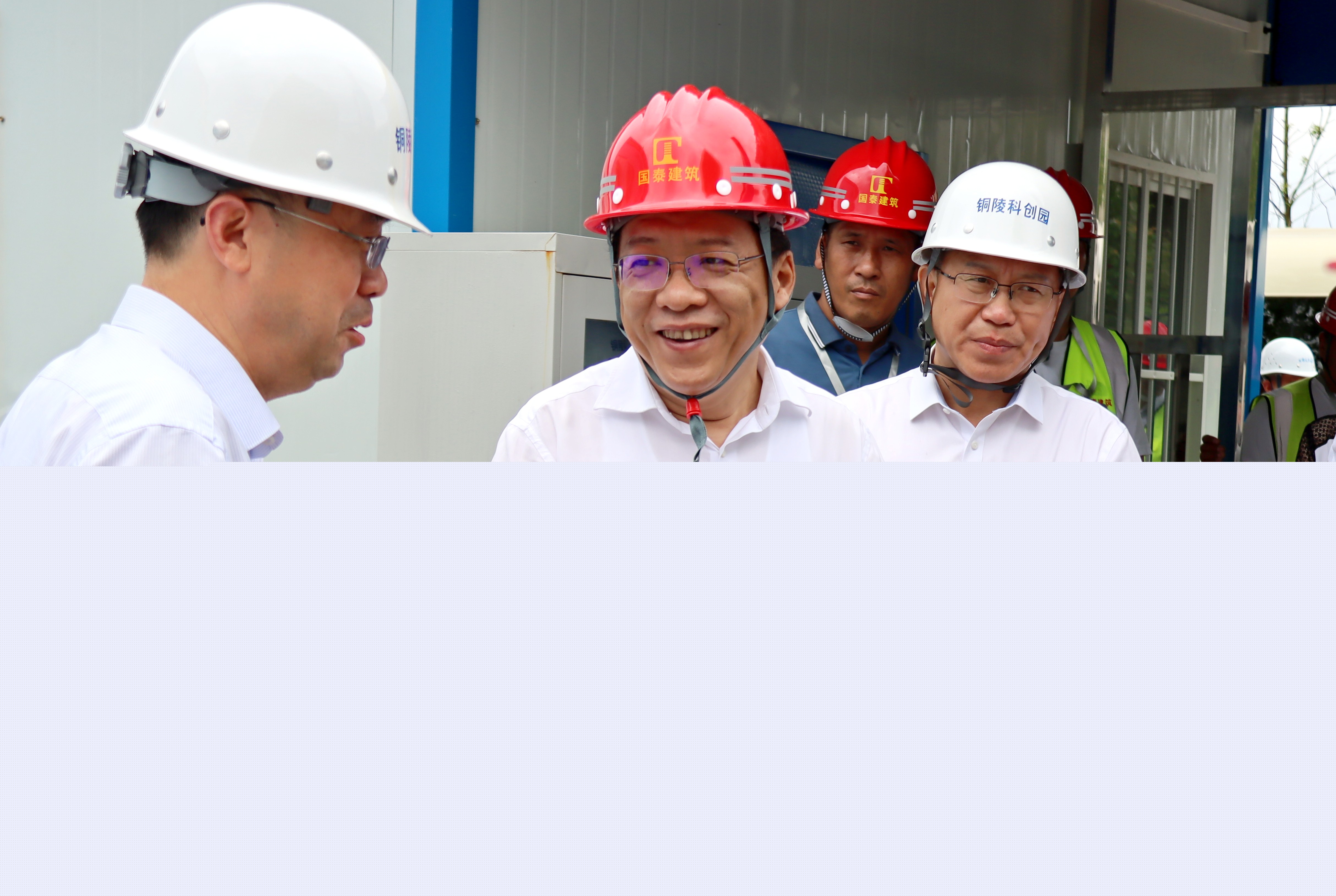 7月30上午,銅陵市委書(shū)記丁純;市委副書(shū)記、市長(zhǎng)孔濤率觀摩團(tuán)調(diào)研考察銅陵市義安區(qū)科創(chuàng)產(chǎn)業(yè)園(EPC)項(xiàng)目。銅陵交投集團(tuán)董事長(zhǎng)吳世偉、國(guó)泰建筑董事長(zhǎng)張自州等人陪同。