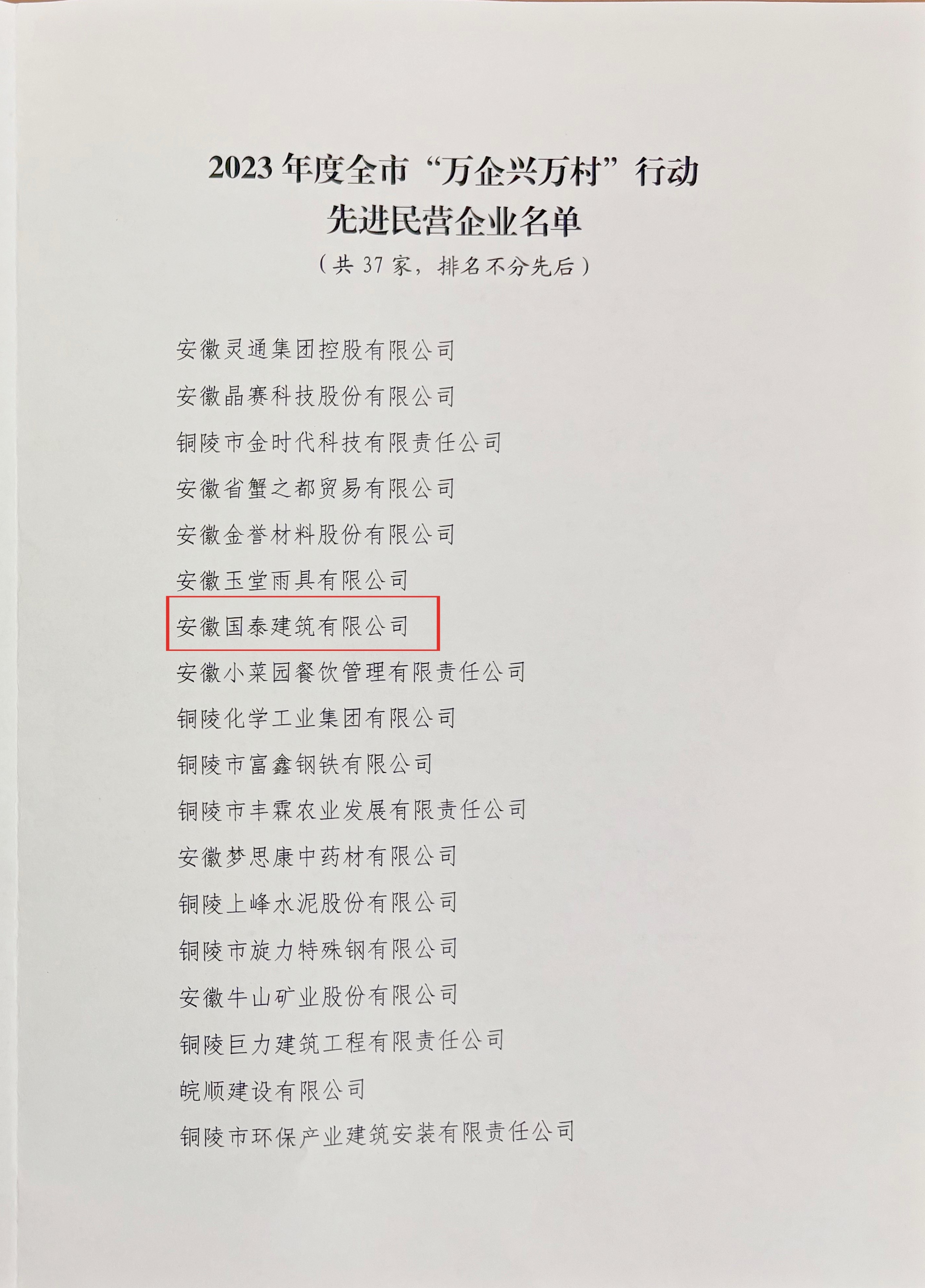 長期以來,在市委市政府的堅強領(lǐng)導(dǎo)下,銅陵市萬企興萬村行動進行得如火如荼。國泰建筑將會珍惜榮譽、再接再厲,秉承“日乾夕惕 至臻至善”的企業(yè)價值觀,用情用力參與“萬企興萬村”行動,助力鞏固拓展脫貧攻堅成果同鄉(xiāng)村振興有效銜接,為銅陵助推高質(zhì)量發(fā)展、加快農(nóng)業(yè)農(nóng)村現(xiàn)代化建設(shè)作出更大的貢獻!